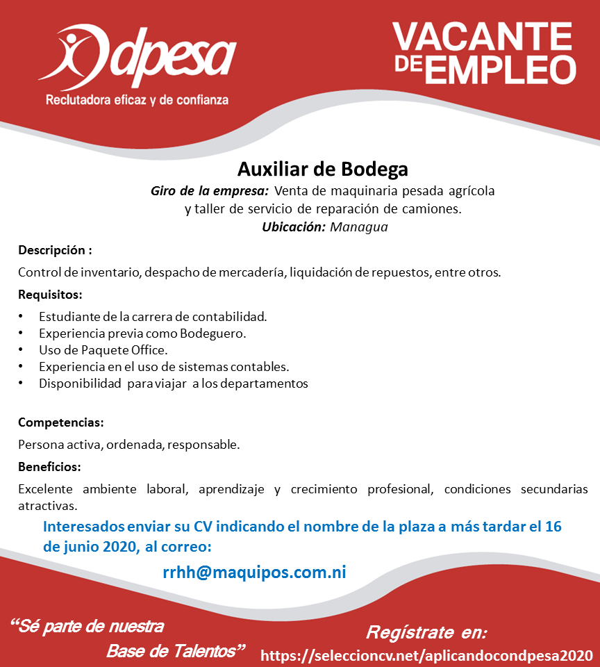 Plantilla publicación de vacantes – Auxiliar de Bodega