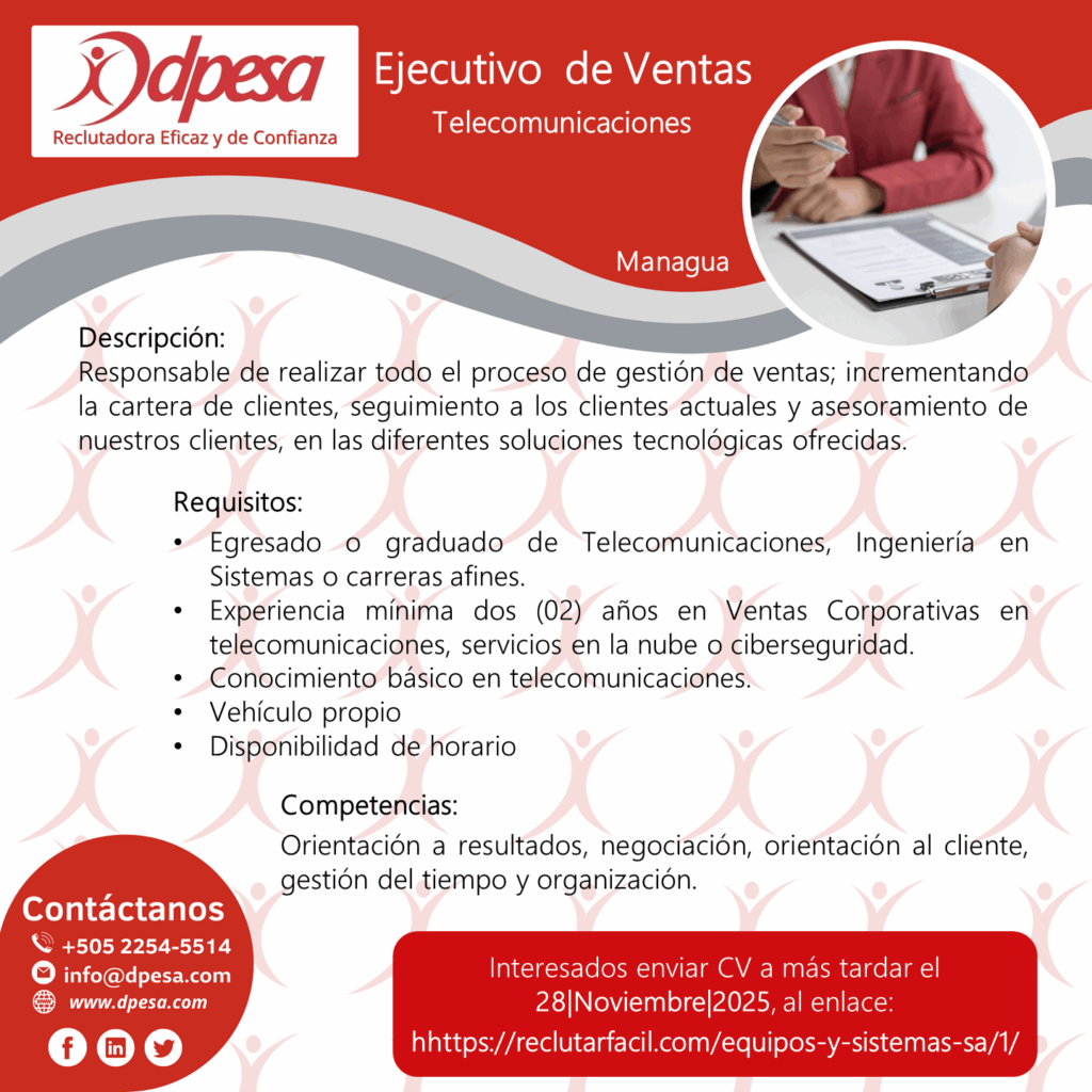 Ejecutivo de Ventas Telecomunicaciones DPESAnoviembre 16, 2025Comercial -Ventas Interesados aplicar a más tardar 28|Noviembre|2025 por medio del enlace: https://reclutarfacil.com/equipos-y-sistemas-sa/1/ Share on FacebookShare on TwitterShare on Linkedin